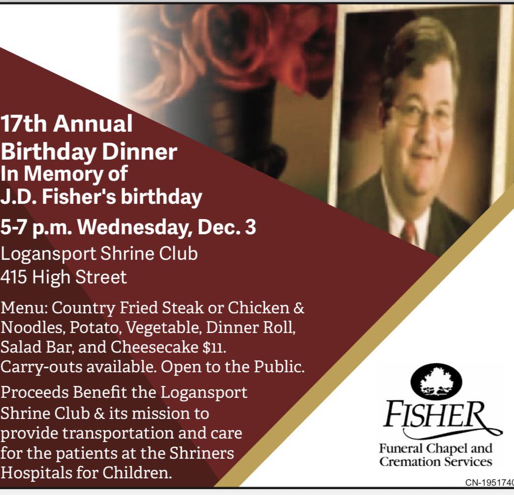5-7 p.m. this Wednesday, Dec. 3, 2025, at the Logansport Shrine Club, for the 17th annual Birthday Dinner in Memory of JD Fisher.