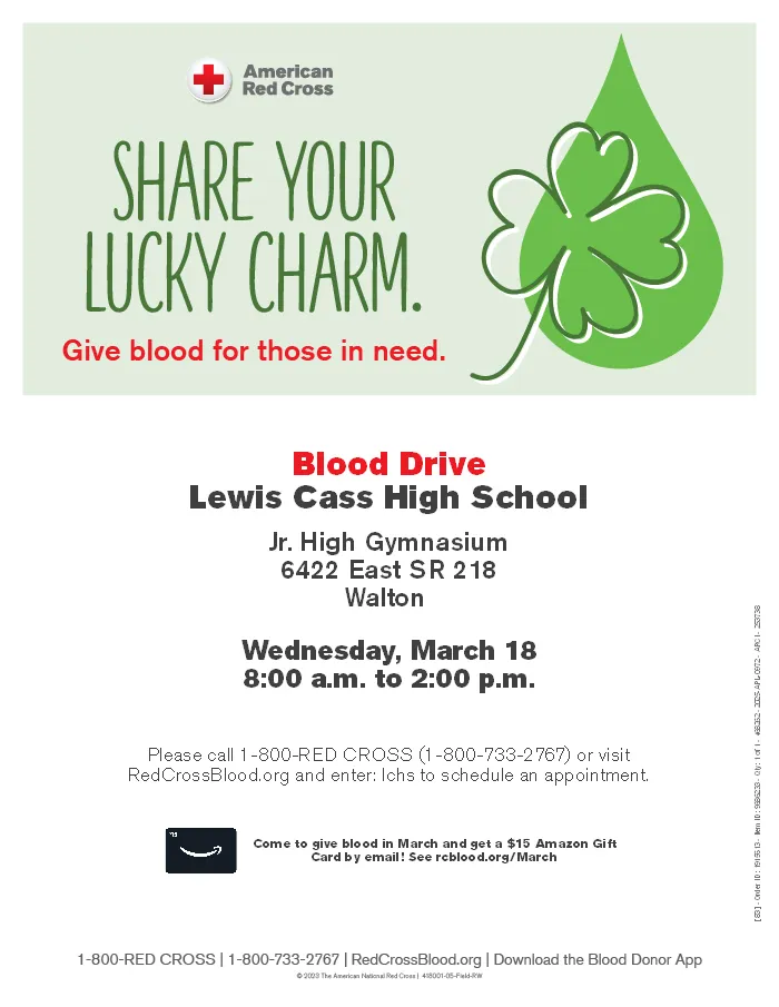 Please call 1-800-RED-CROSS (1-800-733-27670 or visit RedCrossBlood.org and enter: lchs to schedule an appointment.