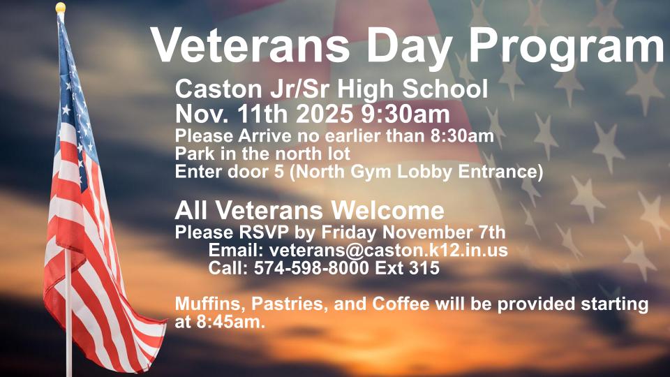 Please mark your calendars for the Caston Veterans Day Program on November 11 at 9:30 AM in the Caston High School Gym. Veterans should RSVP by emailing veterans@caston.k12.in.us or call 574-598-8000, ext 315. All veterans should park in the north parking lot and enter door 5.