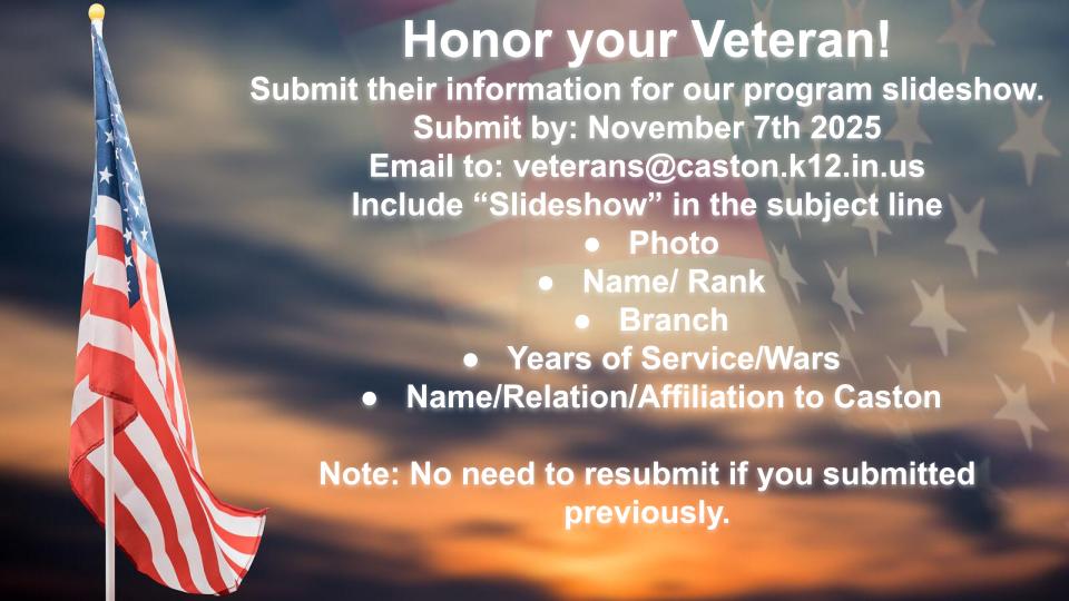 Veterans attending the Caston Veterans Program at Caston on November 11th should RSVP by emailing veterans@caston.k12.in.us or call 574-598-8000, ext 315. Please submit the information on the slide with a photo for the slide show b y November 7th
