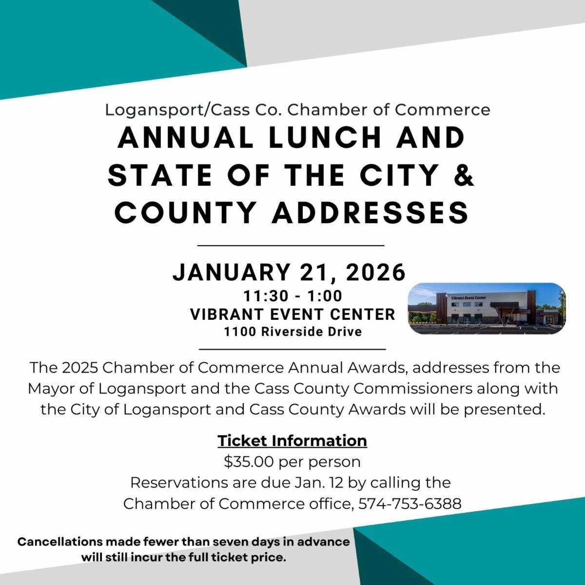 Chamber Annual Lunch and State of the City and County Address | January 21, 2026 | Typically held in mid-January | Organized by Logansport-Cass County Chamber of Commerce | 574-753-6388