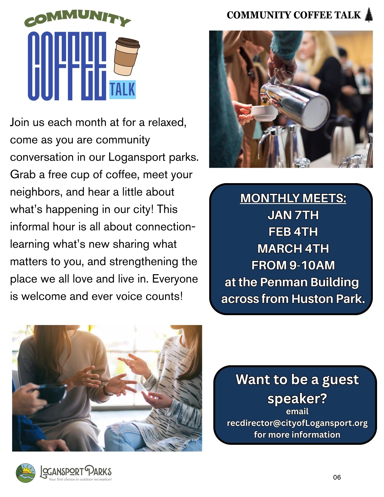 Logansport Parks and Recreation and the Cass County Visitors Bureau invite you each month at for a relaxed, come as you are community conversation in our Logansport parks. Grab a free cup of coffee, meet your neighbors, and hear a little about what’s happening in our city! This informal hour is all about connection- learning what’s new sharing what matters to you, and strengthening the place we all love and live in. Everyone is welcome and ever voice counts!