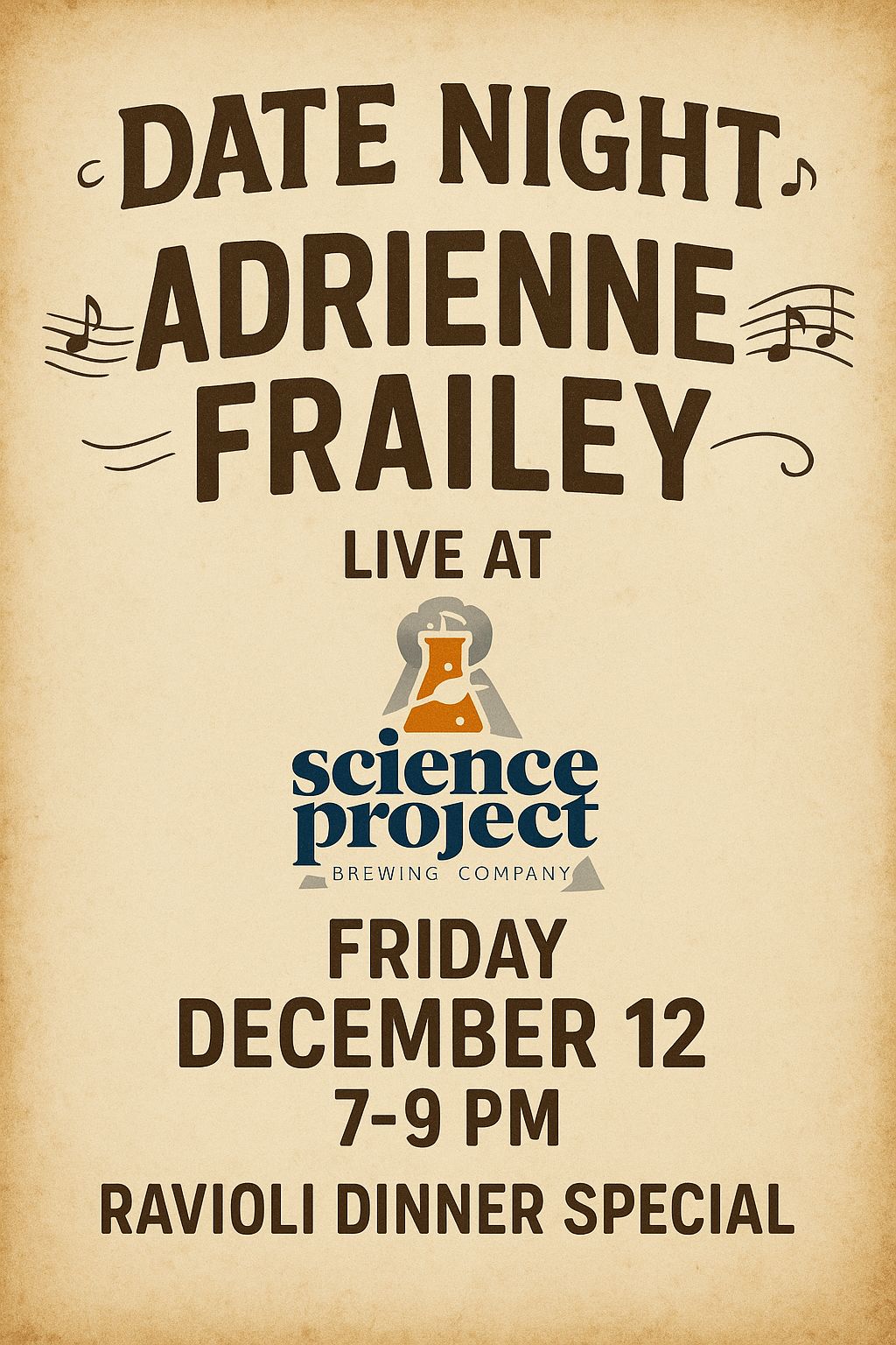 Join us Friday, December 12th from 7–9 PM for a cozy Date Night featuring live music from Adrienne Frailey and a special ravioli dinner feature.