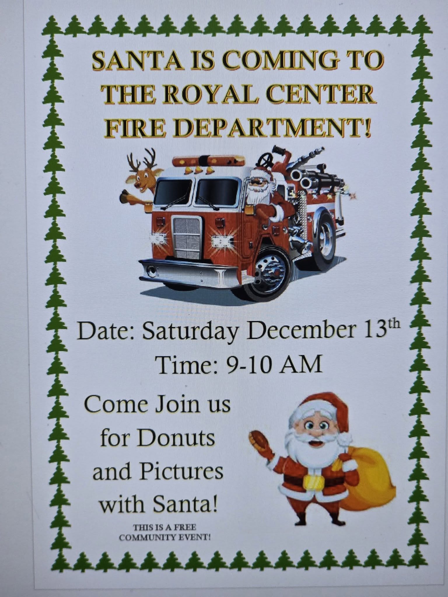 Join the Royal Center Fire Department for Donuts and Pictures with Santa on Dec. 13 from 0-10 a.m. This is a free community event!