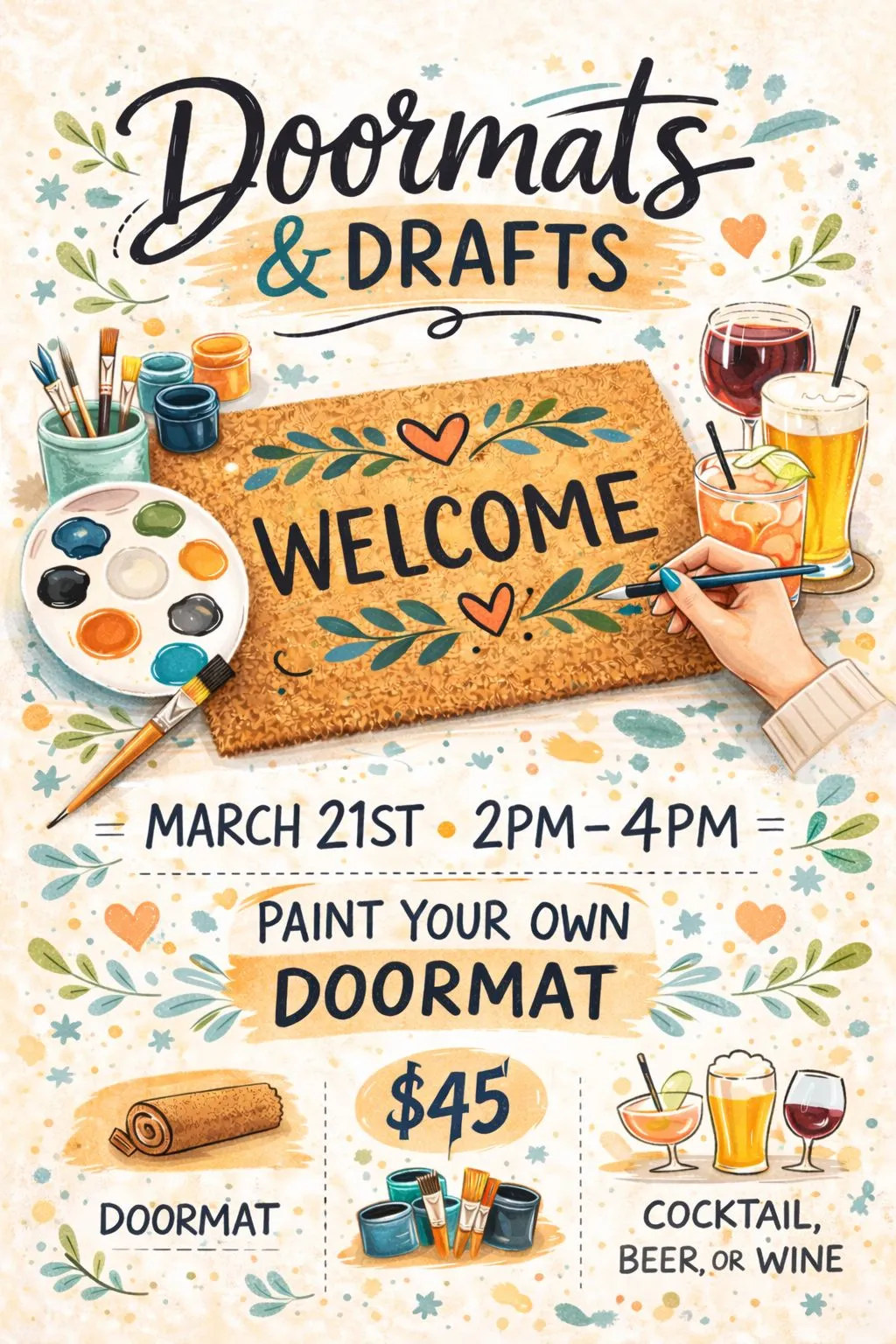 Join us for Doormats & Drafts — a laid-back creative afternoon where you’ll paint your own custom doormat while enjoying a drink.
