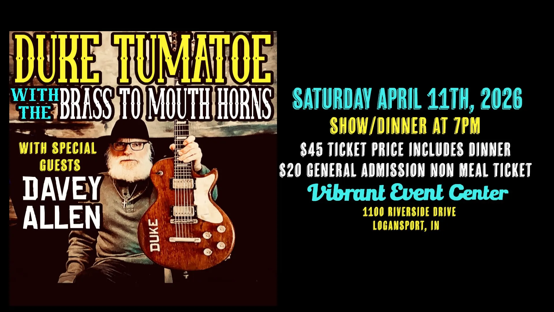 Dinner and a show!!! Join Duke Tumatoe and his Brass To Mouth Band alongside special opener Davey Allen for a night of amazing blues and rock n roll AND wonderful food!