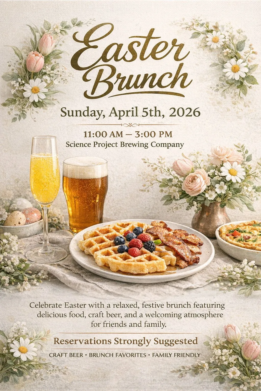 Join us for a relaxed and festive Easter Brunch at Science Project Brewing Company. Enjoy thoughtfully crafted brunch favorites alongside our house-made craft beers in a welcoming, family-friendly setting.