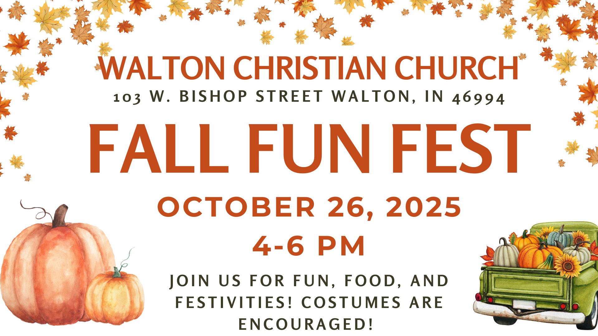 You are invited to Walton Christian Church for the Fall Fun Fest! Candy, games, & festivities! Costumes are encouraged!