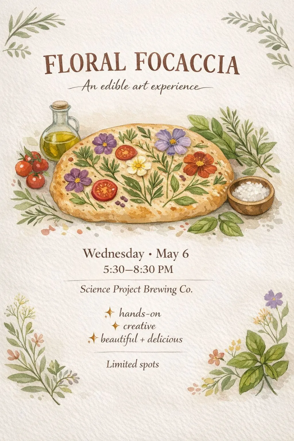 Join us for a hands-on experience where dough becomes a canvas. Using herbs and vegetables you’ll create a beautiful, one-of-a-kind focaccia—designed, proofed, and baked during the workshop.