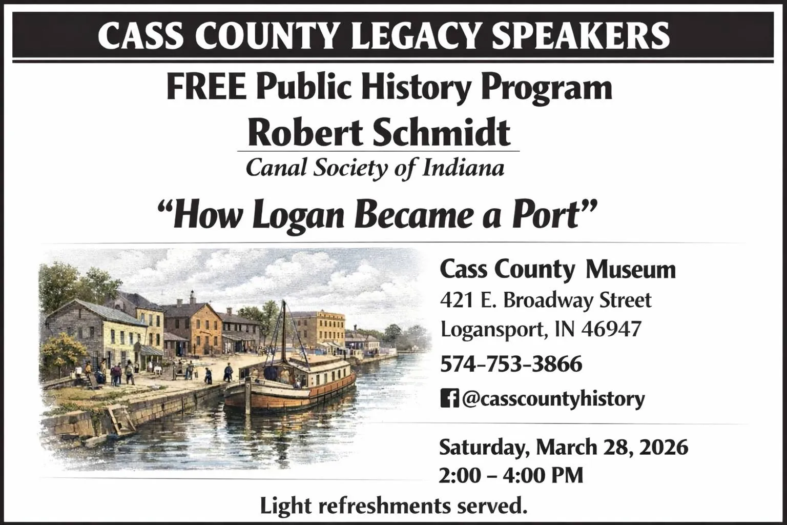 Join us for our first Cass County Legacy Speaker event of the year! Robert Schmidt of the Canal Society of Indiana will be presenting a free history lesson at Cass County Museum on Saturday, March 28, 2026, 2-4 PM. Light refreshments will be served.