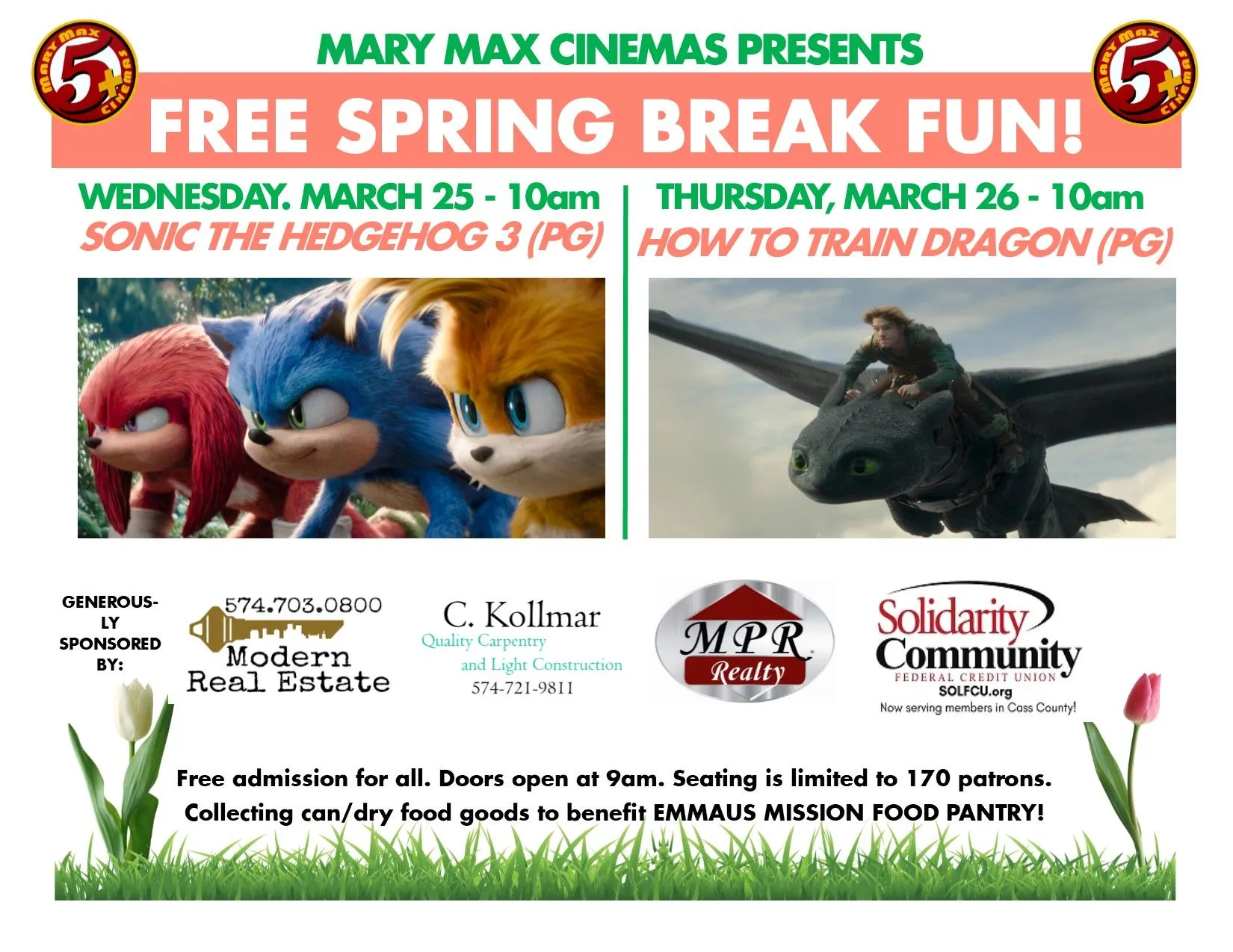 Free admission for all. Doors open at 9 a.m. Seating is limited to 170 patrons. Collecting can/dry food goods to benefit Emmaus Mission Food Pantry. FREE Spring Break movies sponsored by Modern Real Estate, Chris Kollmar Construction, MPR Realty, Solidarity Community Federal Credit Union