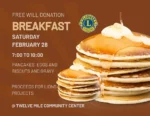Pancakes, eggs and biscuits and gravy. Proceeds for Lions Projects. Saturday, Feb. 28 from 7-10 a.m. at Twelve Mile Community Center.