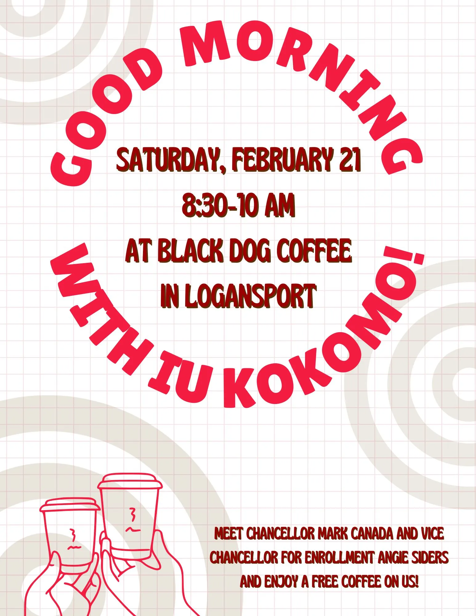 Come meet the Chancellor and Vice Chancellor for Enrollment and get a free cup of coffee on IUK!
