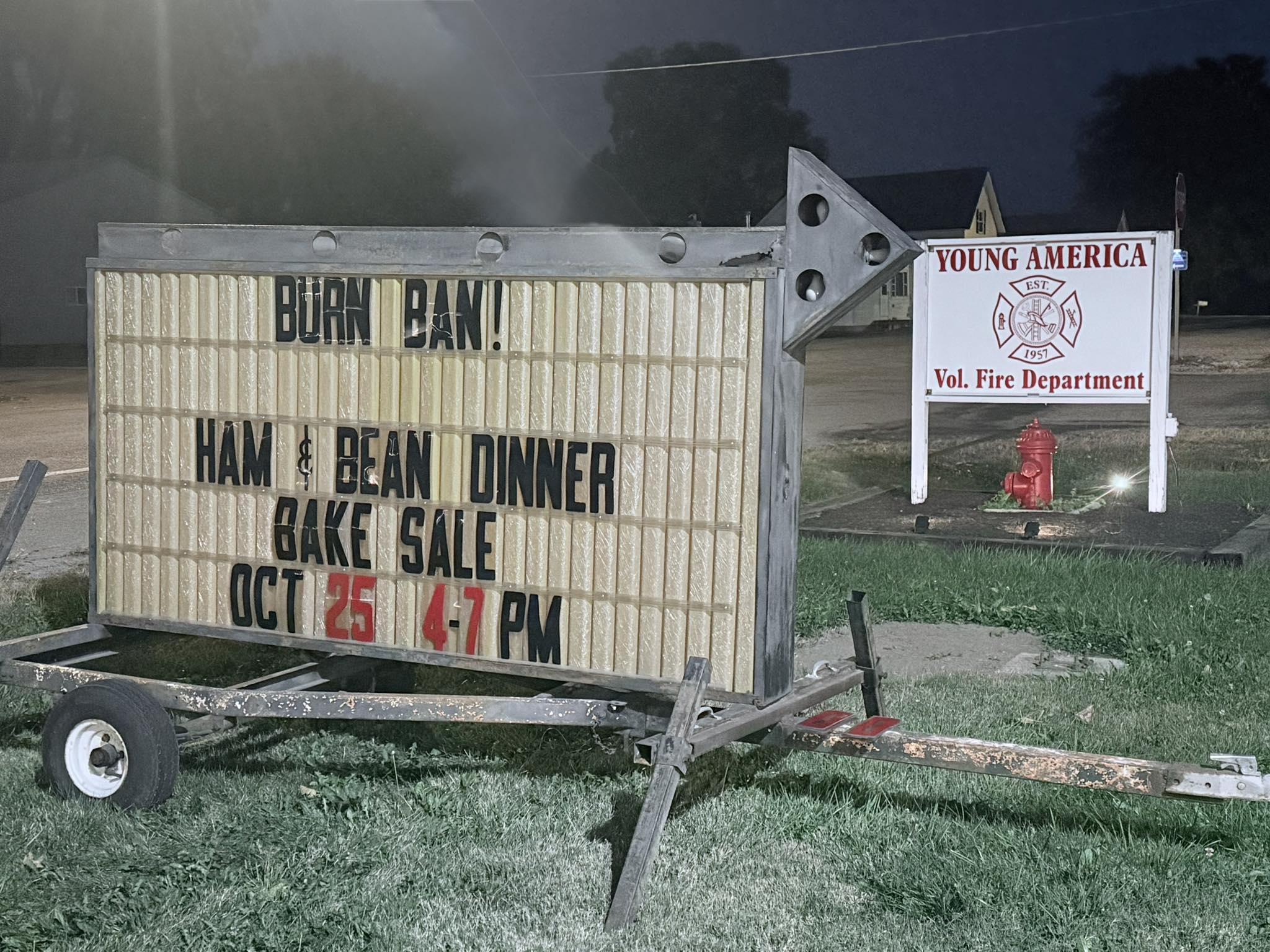 Young America Fire Department’s Ham & Bean Dinner and Bake Sale Saturday October 25th 4-7pm.