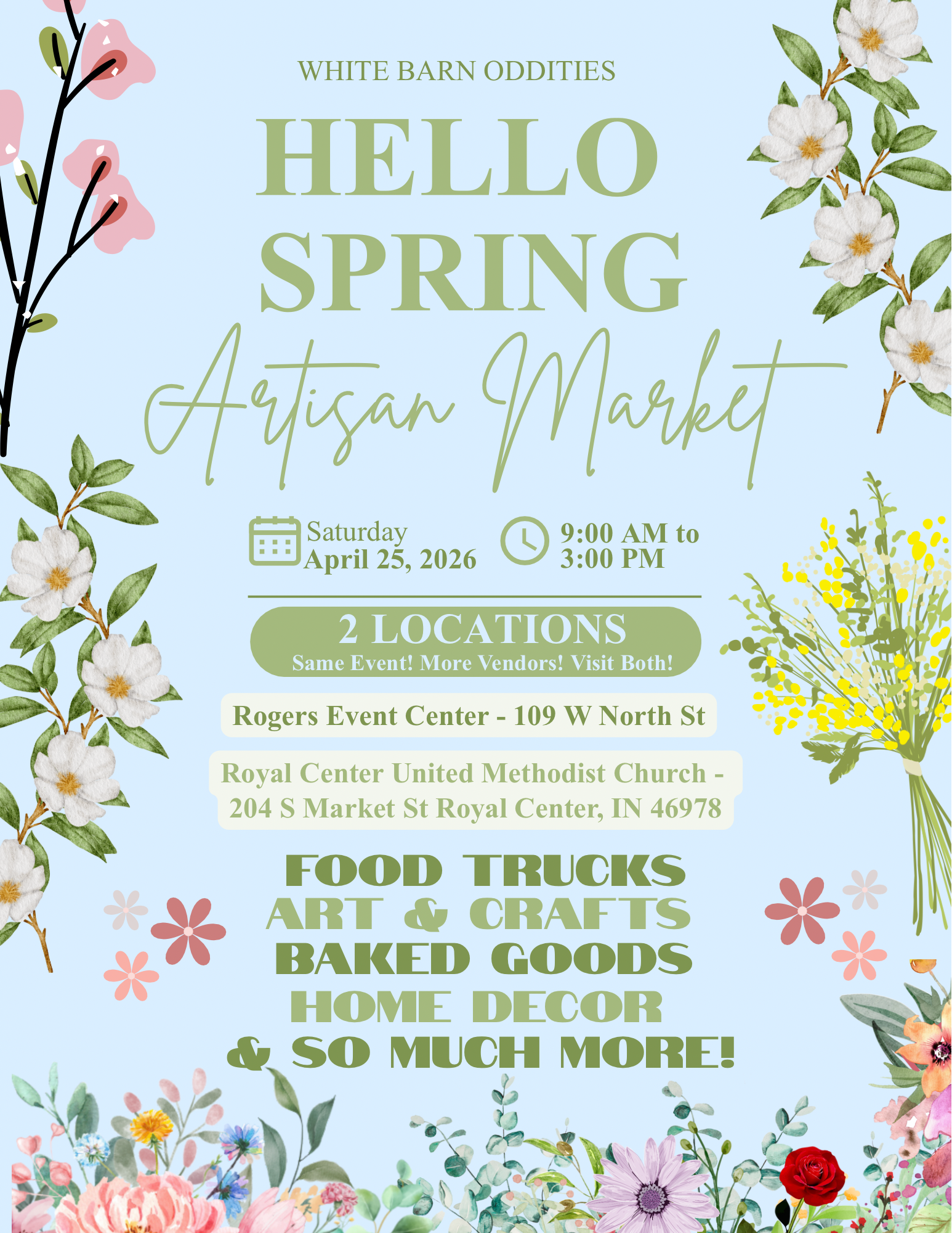 Join us at Rogers Event Center (109 W N St) and Royal Center United Methodist Church (204 S Market St) in Royal Center, Indiana, on April 25, 2026 from 9:00 AM to 3:00 PM for the first Hello Spring Artisan Market.