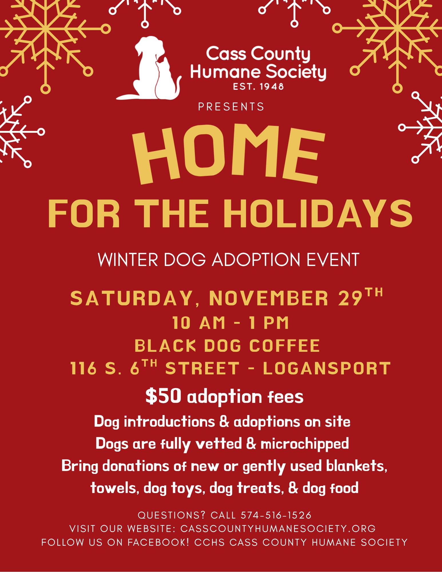 Join us in beautiful downtown Logansport behind Black Dog Coffee on Small Business Saturday and come meet your new best friend! We will have dogs available for adoption at the incredible price of $50, which includes their neuter/spay, microchip, vaccinations, heartworm testing, and monthly flea/tick/heartworm prevention. We will also be collecting donations of new or gently used blankets, towels, dog toys, and bags of dog or cat food at this time!