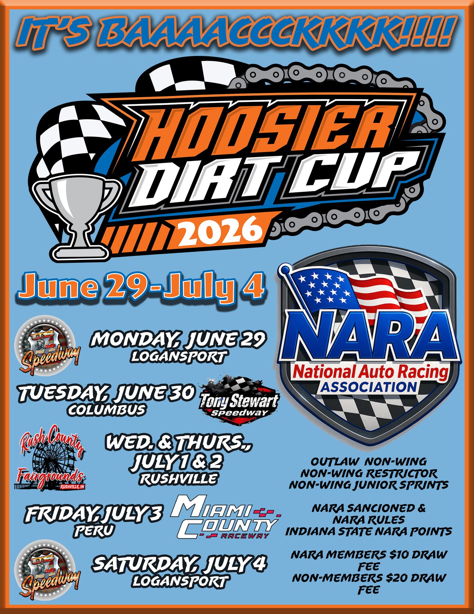 NARA members will be able to gather points each night, as they battle for national and state supremacy. There will also be a Hoosier Dirt Cup points champion in each division. We will be working on a points fund for the Hoosier Dirt Cup in the coming months, as well.