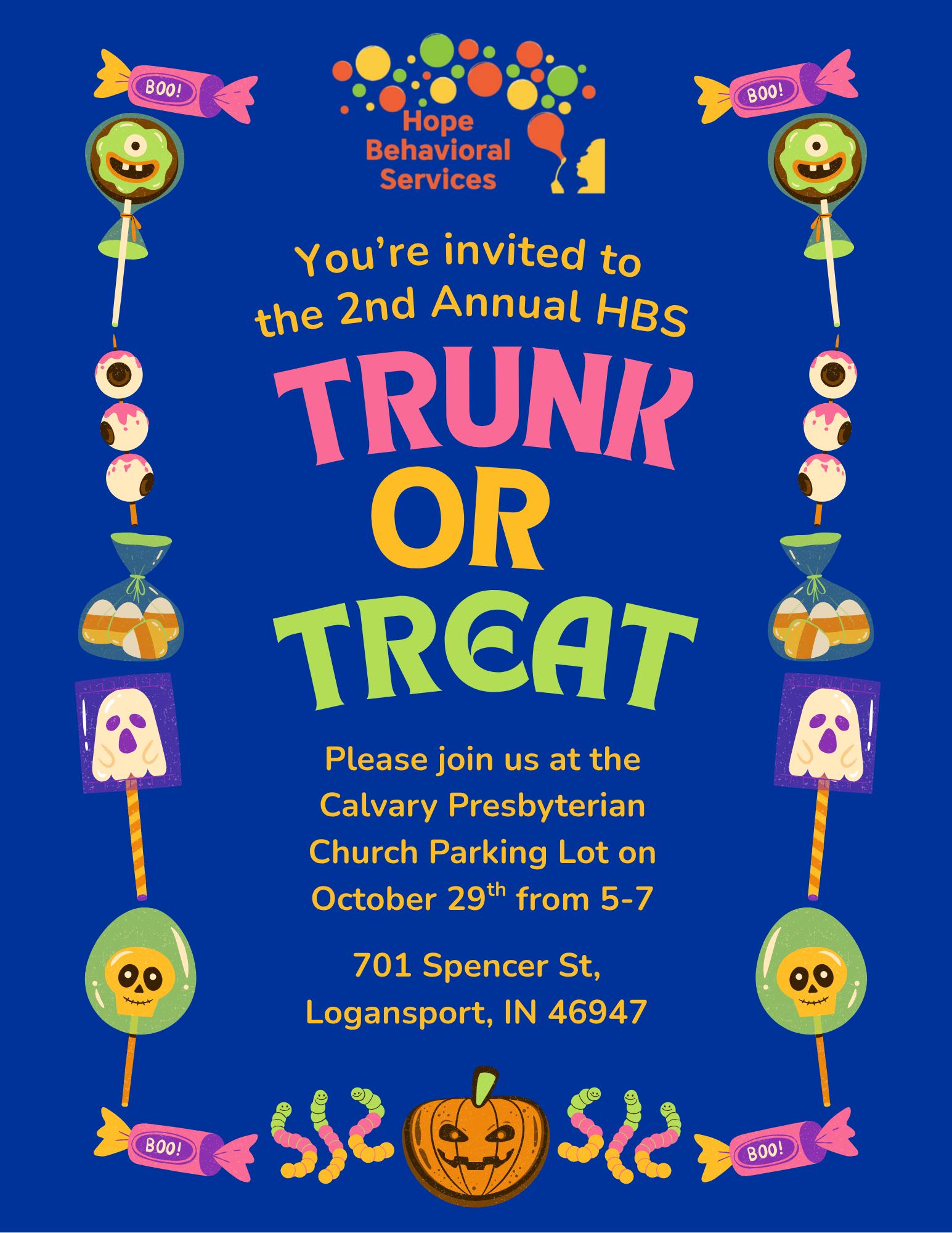 Join Hope Behavioral Services at Calvary Presbyterian Church parking lot at 701 Spencer Street from 5:00-7:00 p.m. Oct. 29, 2025 for an evening full of costumes, games, treats and lots of fun!