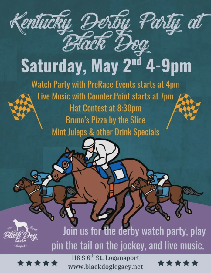 Get ready for Derby thrills at **Black Dog** on **Saturday, May 2nd**! We’re kicking things off at **4:00 PM** with a high-energy watch party featuring **Bruno’s Pizza** by the slice, ice-cold **mint juleps**, and exclusive drink specials. The party really moves when *Counter.Point* takes the stage for live music at 7:00 PM leading up to our big hat contest at 8:30 PM. From the first post to the final note, come eat, drink, and show off your best Derby style with us until 9:00 PM!
