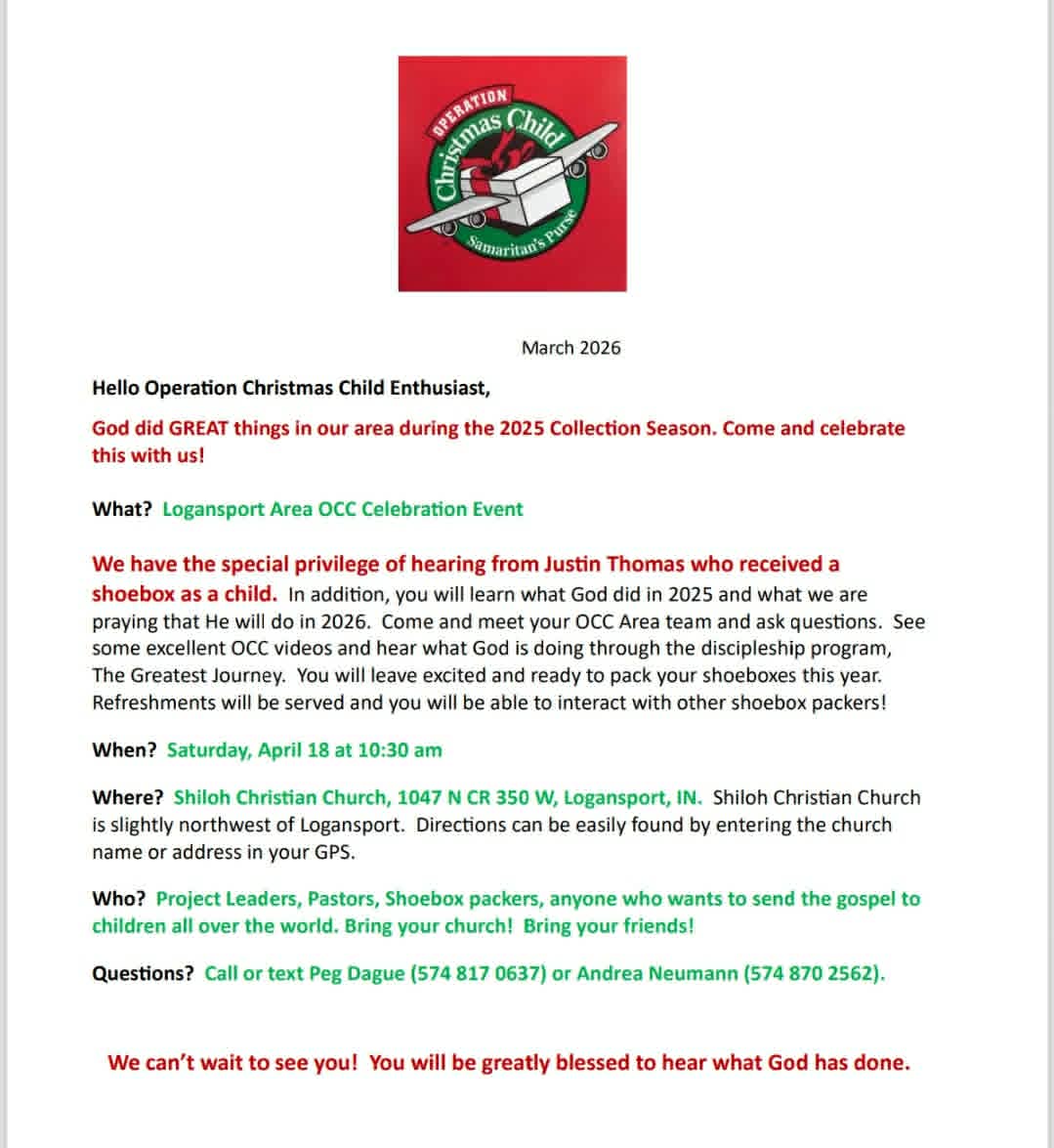 If you are in the Cass, Fulton, Miami or Pulaski County Areas, and you helped with Operation Christmas Child for the 2025 collection season, then this event is for you! Come see all that God has done through all the shoeboxes that were collected last year, and Celebrate with us! Hear from a former Shoebox Recipient and from project leaders all over our counties. Have questions about how to become involved this year? We can help with that as well! Bring your friends, family, and churches and enjoy a light refreshment as you hear about all the wonderful things God is doing through OCC!