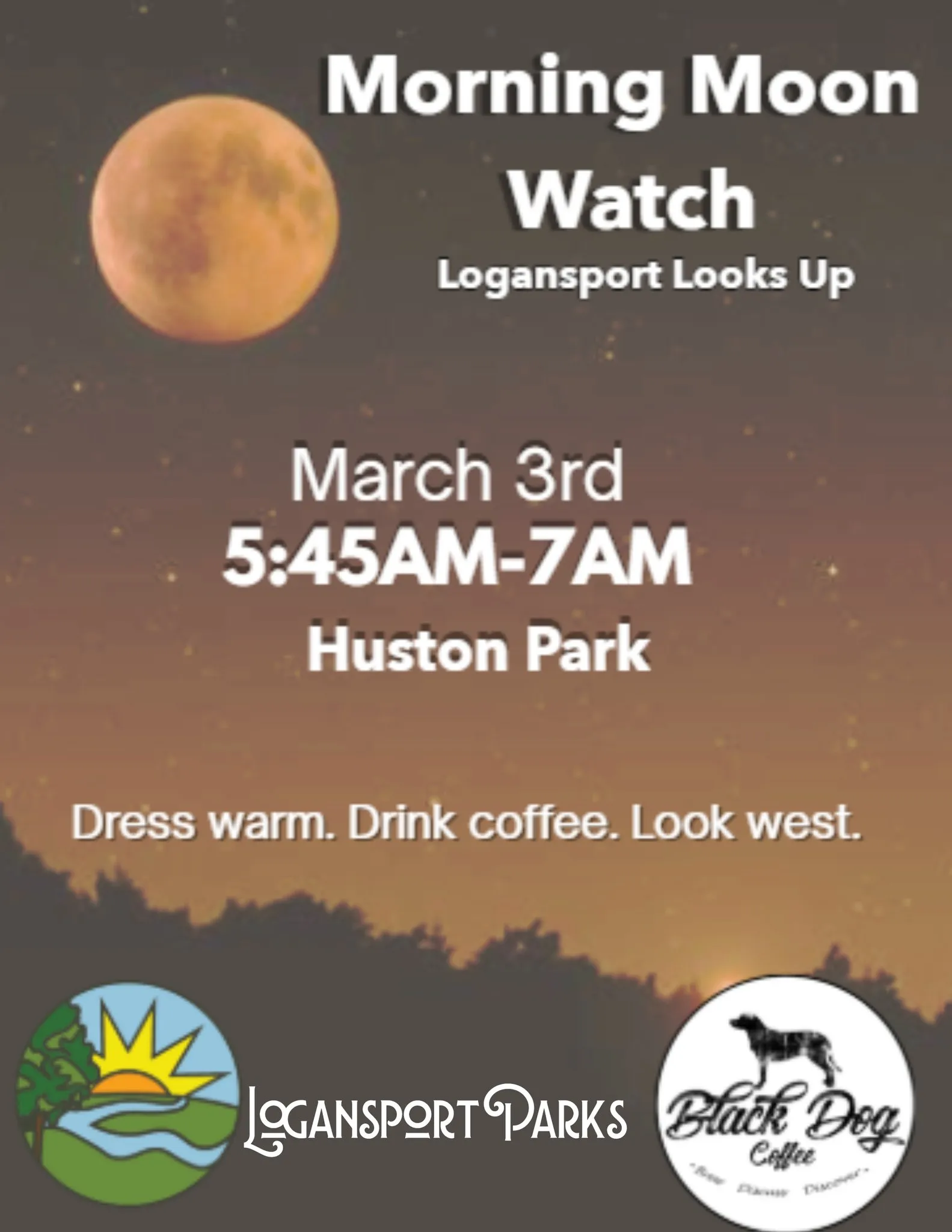 We’ll gather quietly in the southeast field area of Huston Park to watch the Moon turn a deep copper red before it sets, with our amazing friends at Black Dog Coffee.
