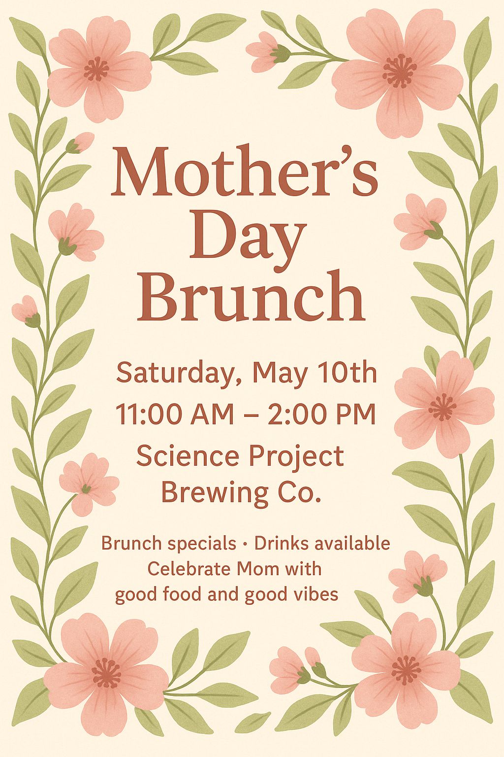 Join us for a relaxed Mother’s Day brunch from 11:00 AM–2:00 PM at Science Project Brewing Co. Treat the moms in your life (or yourself!) to delicious brunch specials, drinks, and a laid-back atmosphere perfect for catching up and celebrating together.