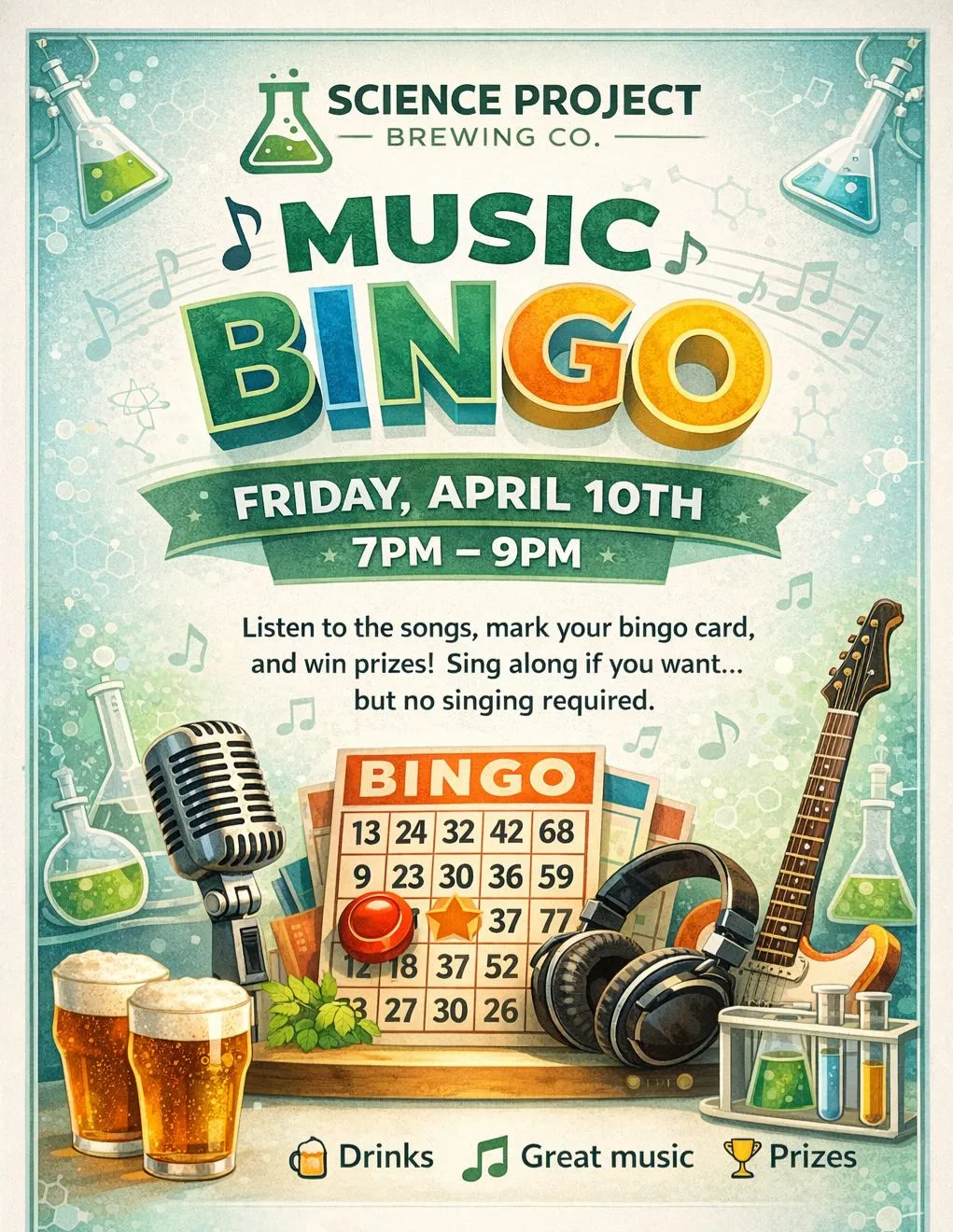 Join us for a fun night of Music Bingo on Friday, April 10th from 7PM–9PM at Science Project Brewing Company!