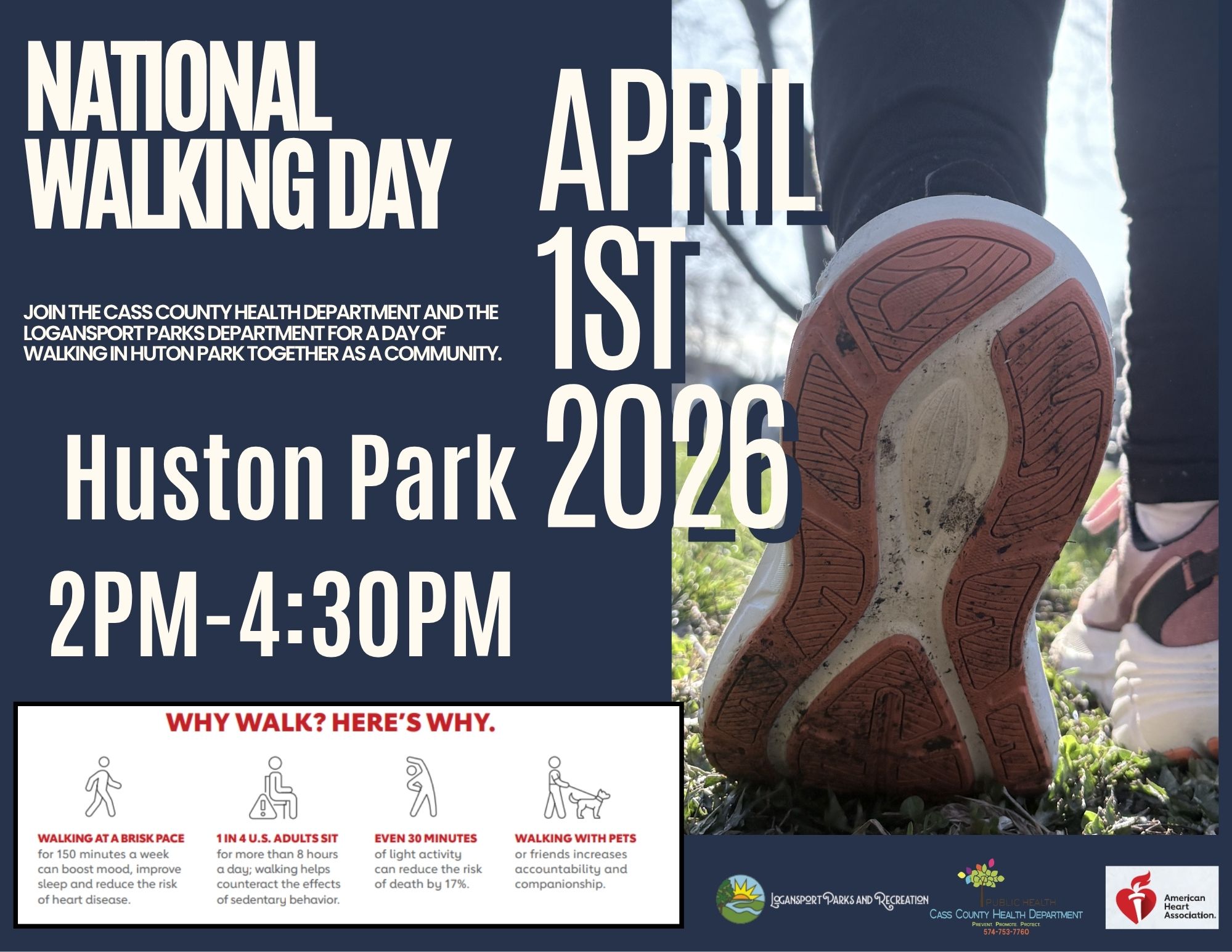 Logansport Parks & Recreation, in partnership with the Cass County Health Department, invites community members of all ages to celebrate National Walking Day on Wednesday, April 1, 2026, from 2- 4:30 p.m. at Huston Park.