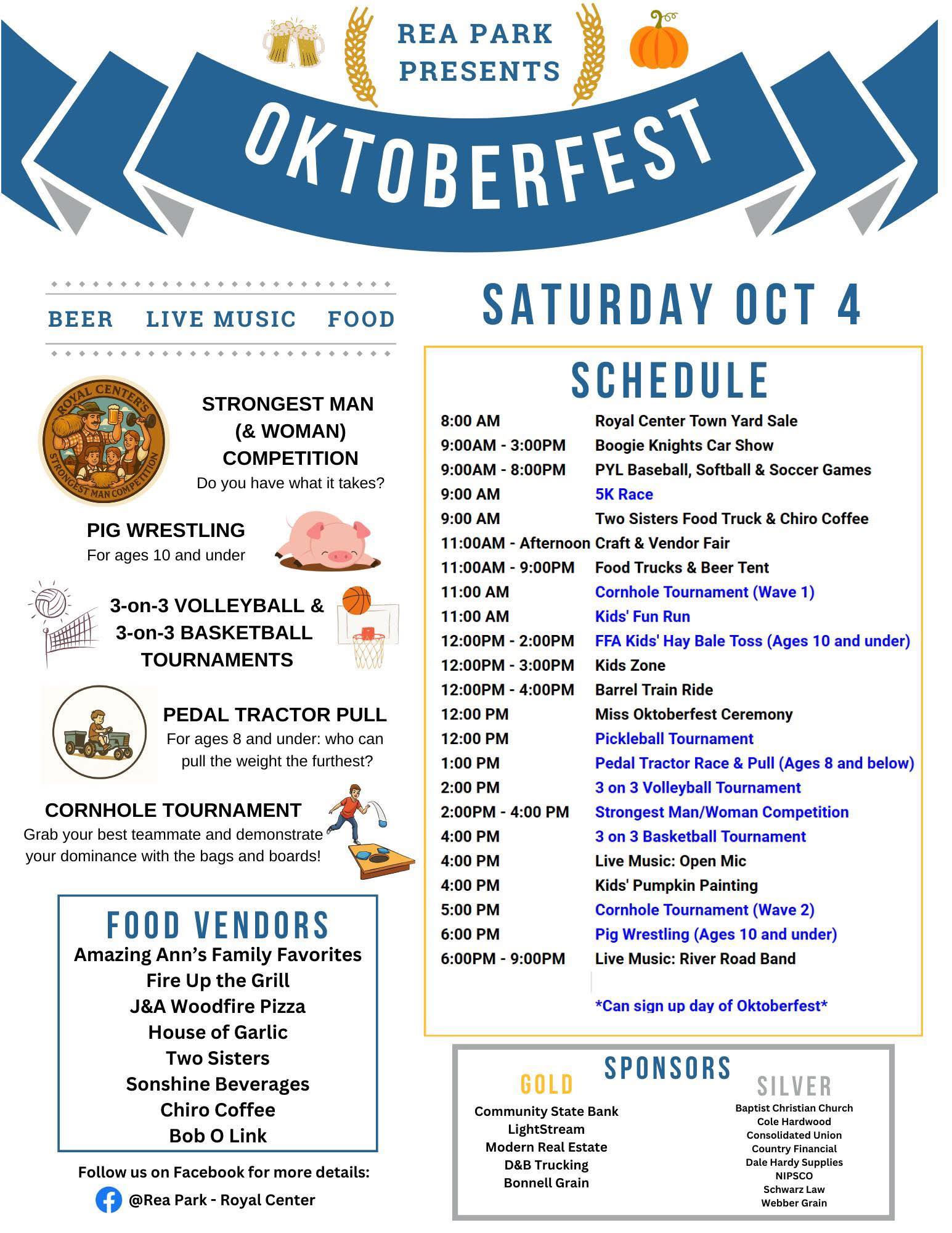 Rea Park of Royal Center is hosting their 5th Annual Oktoberfest! Mark your calendar now for a day of fun starting with a Car Cruise-In, Pioneer Youth League games. Continuing throughout the day you’ll find a Cornhole Tournament, Live Music, Beer Tent, Food Trucks, Craft and Vendor booths in addition to Family-Friendly games like the HayBale Toss and the Pedal Tractor Race! Don’t forget about the 5K Race!