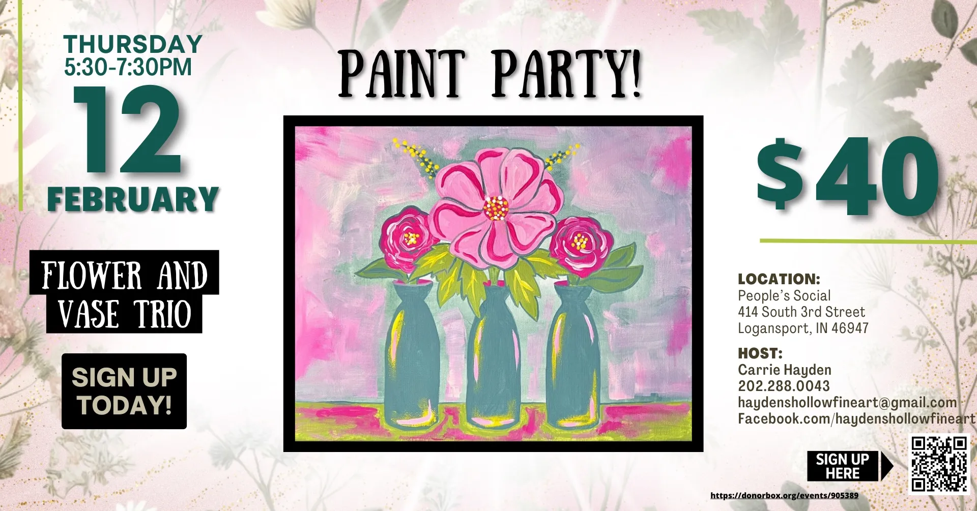 Come out for a paint and sip, and let’s welcome an early spring with this lovely set of flowers in their vases!