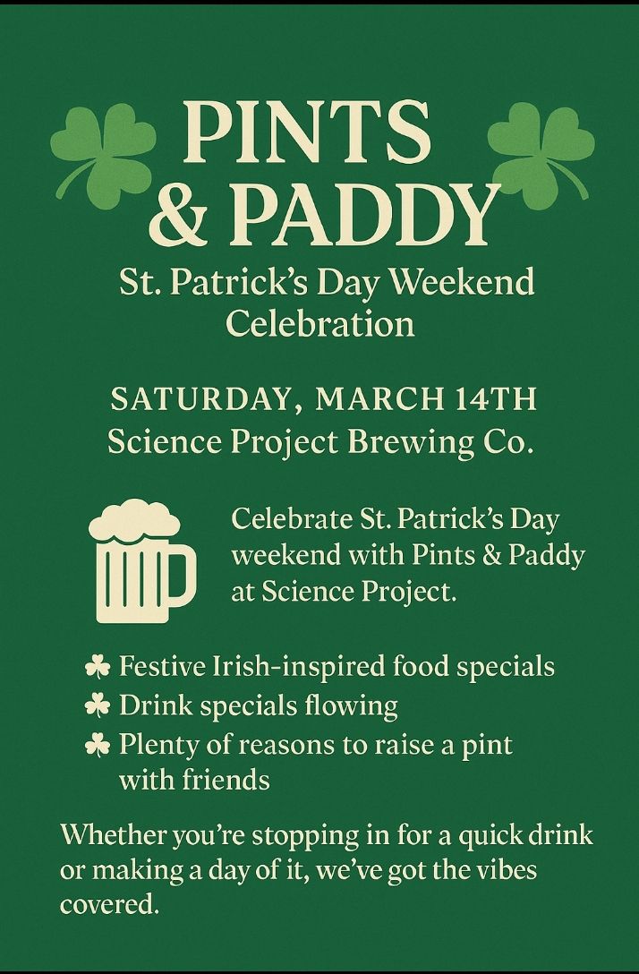 Celebrate St. Patrick’s Day weekend with Pints & Paddy at Science Project Brewing Co. on Saturday, March 14th.