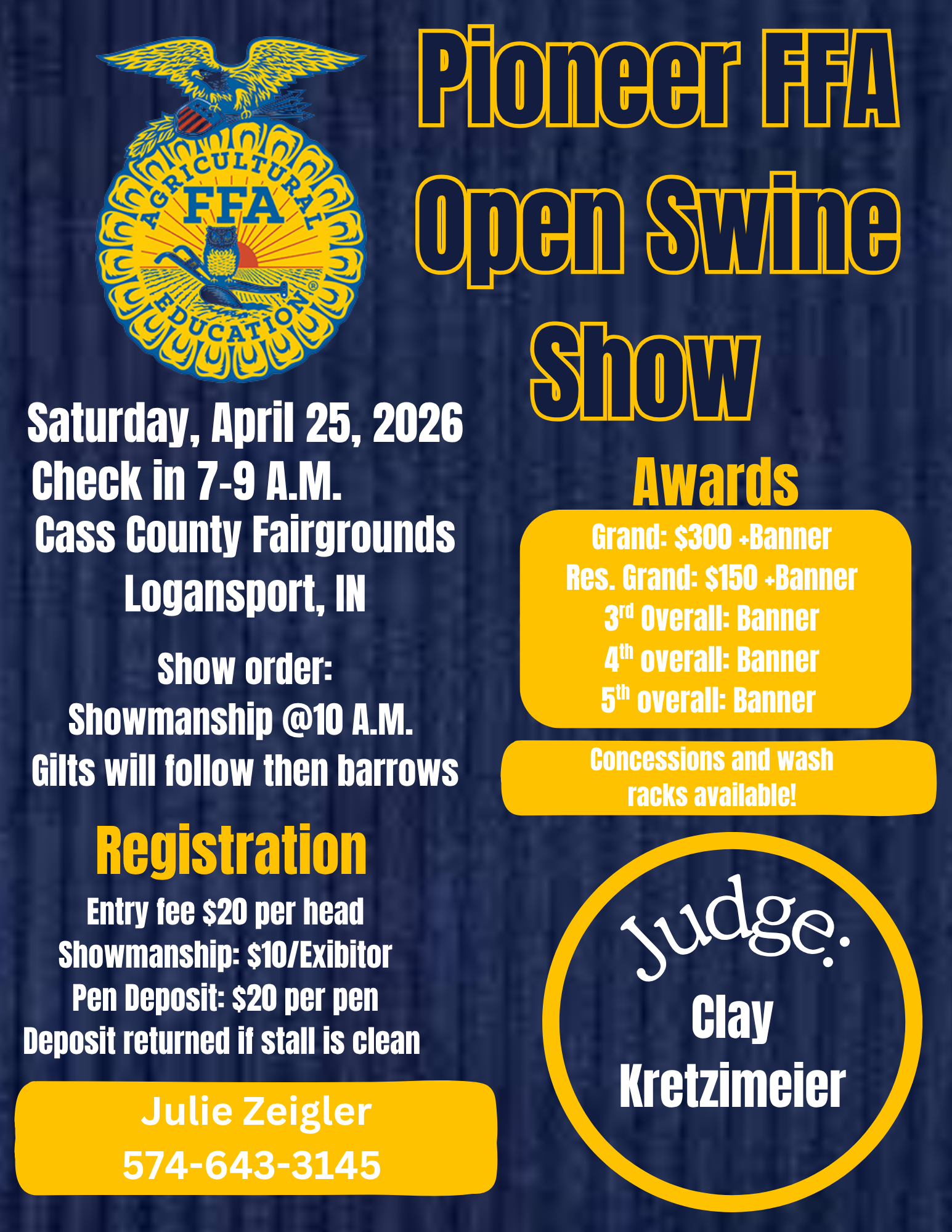 Pioneer FFA is hosting an open swine show on April 25th starting at 10 am. at the Cass County 4-H Fairgrounds. Funds raised will be used for supporting our chapter activities.