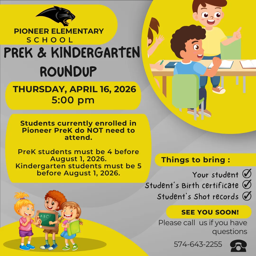 Students currently enrolled in Pioneer Pre-K do not need to attend. PreK students must be 4 before August 1, 2026. Kindergarten students must be 5 before August 1, 2026.