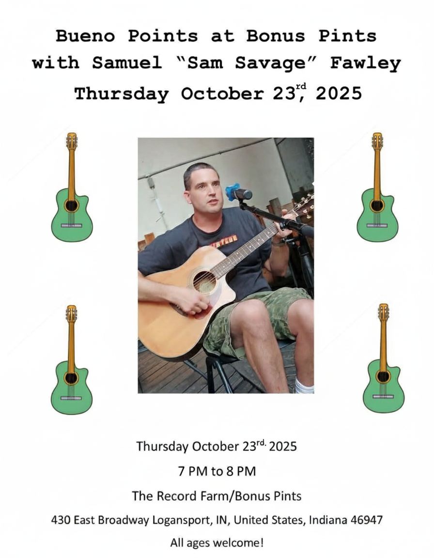 Sam Fawley will be be playing a gig at The Record Farm/Bonus Pints with an eclectic repertoire of acoustic guitar music.