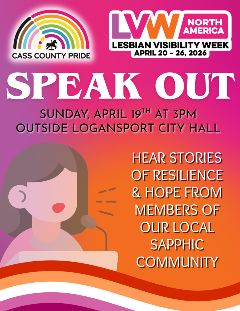 Join members of Cass County Pride outside of Logansport City Hall– the seat of our county– on Sunday at 3 p.m. as we usher Lesbian Visibility Week in for our local community!