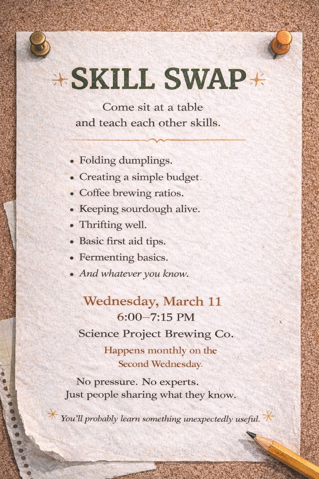 Skill Swap is a relaxed night where people sit together and teach each other simple skills. No stage. No experts. No pressure.