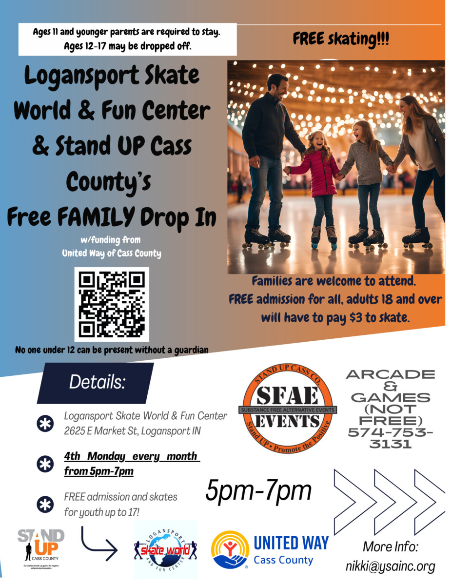 **Please note these are “drop in” events and are open to any family in Cass County and RSVP is not required. They are welcome to come at anytime during the allotted time frame for free. We will not be held liable if youth leave before the completion of the event, also ALL PARTICIPATING IN THESE ACTIVITIES DO SO WITH THE KNOWLEDGE OF THE DANGER INVOLVED, AND AGREE TO ASSUME ANY AND ALL RISKS OF BODILY INJURY, ETC., WHETHER THOSE RISKS ARE KNOWN OR UNKNOWN. Logansport Skate World and Stand UP Cass County will not be held liable.
