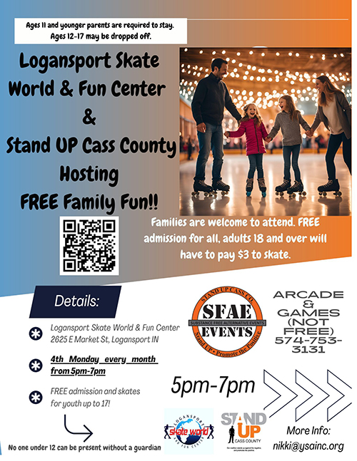 Join us for this “drop in” event! Logansport Skate World and Stand UP Cass County have partnered to bring you a FREE monthly event. This used to be only for youth, we now invite families to attend! The last Monday of each month join us from 5pm-7pm for a FREE skating event. FREE entry and skates for all. Adults 18 and over must pay $3 to skate.