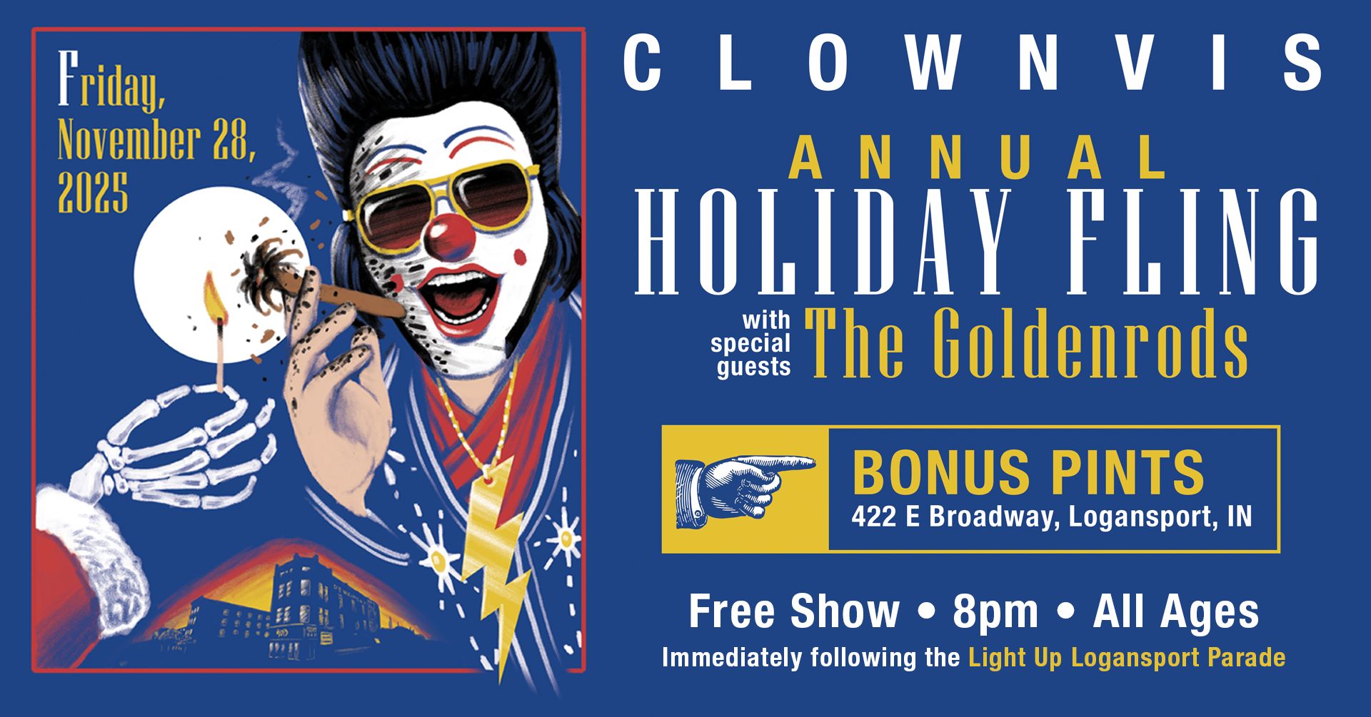 Its the most wonderful time of the year…. People travel from all around to get a glimpse of the crown prince of comedy and roll n roll! The mighty Clownvis returns to usher in The Holiday Season with special guests The Goldenrods! This event is FREE & ALL AGES. The show starts immediately after the Light Up Logansport Parade!