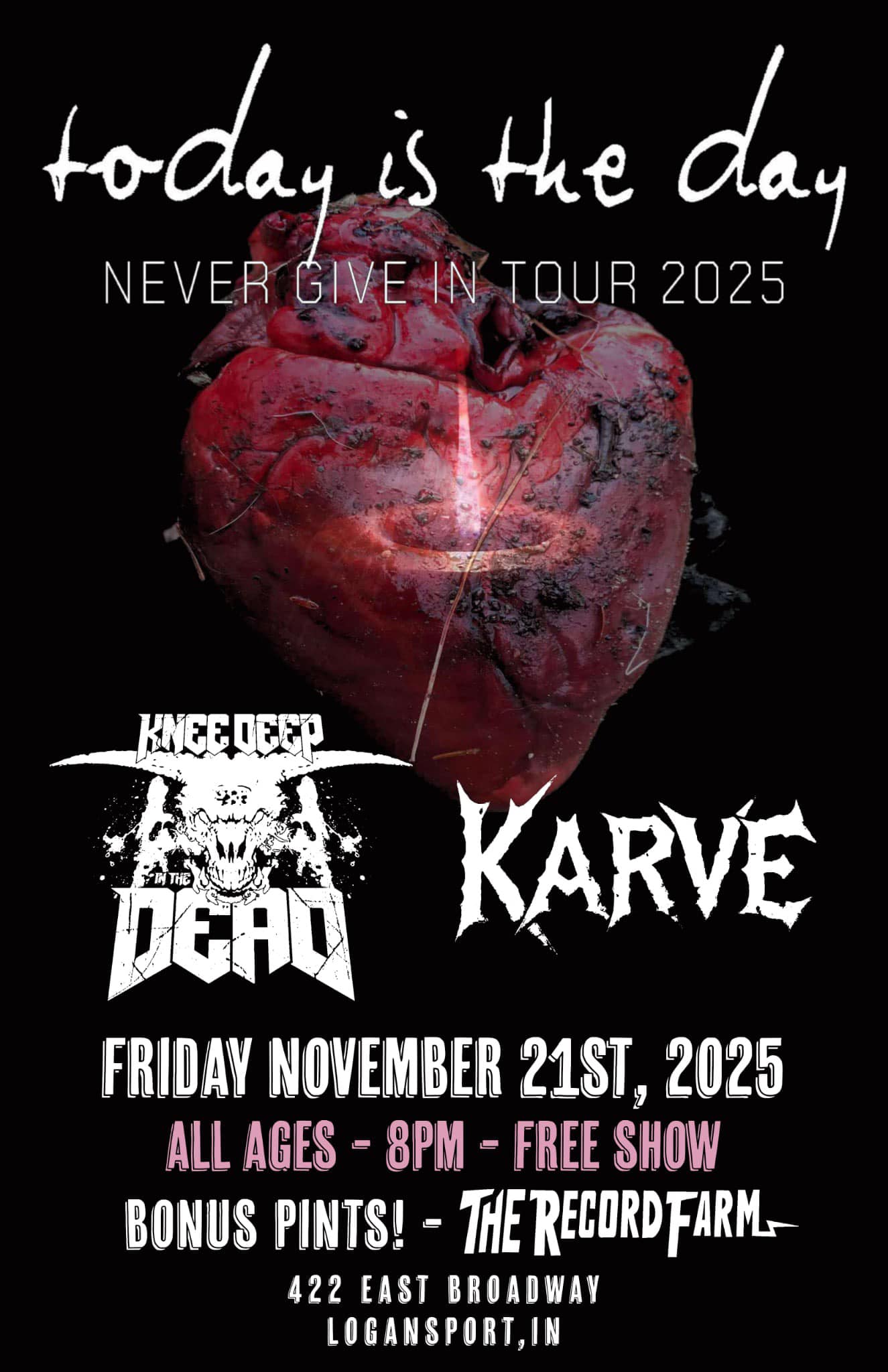 TODAY IS THE DAY celebrate their new album “Never Give In” with a tour stop in beautiful downtown Logansport. Today Is the Day is an American noise rock and experimental metal band that originally formed in Nashville, Tennessee. The band’s diverse sound combines influences from areas such as noise music, avant-garde metal, grindcore, post-hardcore, and alternative rock among other genres. Most of the band’s recordings make extensive use of dissonance and sampling, as well as unusual production techniques and psychedelic overtones. TITD has released a prolific catalog with labels such as Amphetamine Reptile, Southern Lord, Relapse and more! Joining this show will be midwest death/grind legends KNEE DEEP IN THE DEAD delivering a bludgeoning attack of effortless punk inspired death metal. Skinless meets Black Flag. Local sludge metal kids KARVE will open this show.