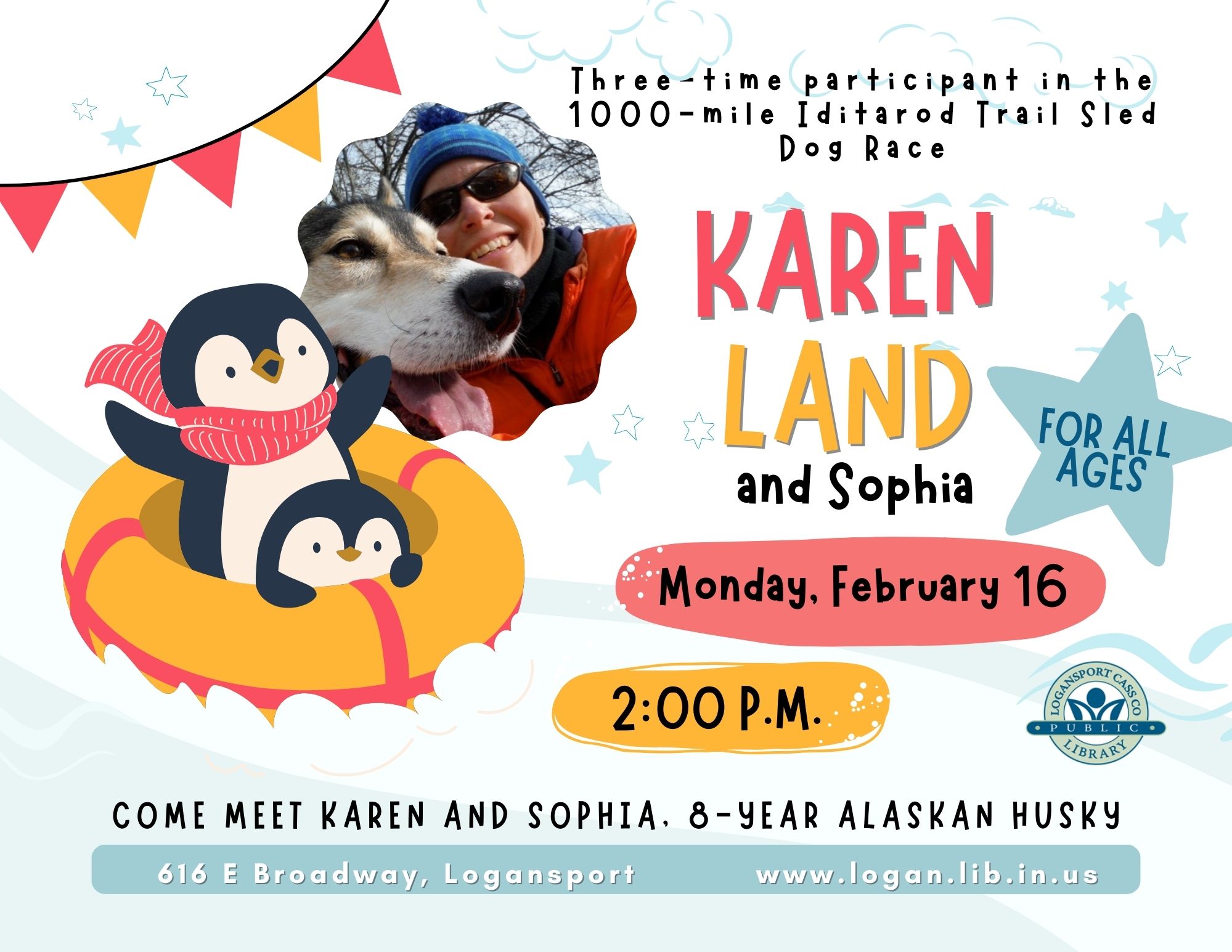 Karen Land is a writer, public speaker, and three-time participant in the 1000-mile Iditarod Trail Sled Dog Race as well as many other sprint and endurance races in Alaska, Canada, Montana, Idaho, Wyoming, and Maine. Since 2000, Land has traveled to nearly every state with her dog sled, mushing gear, Arctic clothing, and beloved dogs, giving over a thousand school and public library presentations. This program is for all ages.