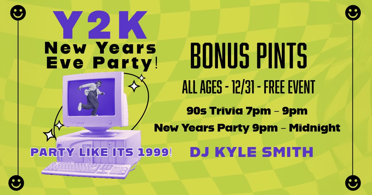 We love a fun and original idea… we love a themed party. We love to make it FREE and include the whole family. So here it is! Remember the thrill of the Y2K hysteria 25 years ago? Lets party like its 1999 and ring in the New Year dancing the night away! NYE is a Wednesday and that means trivia as well!!